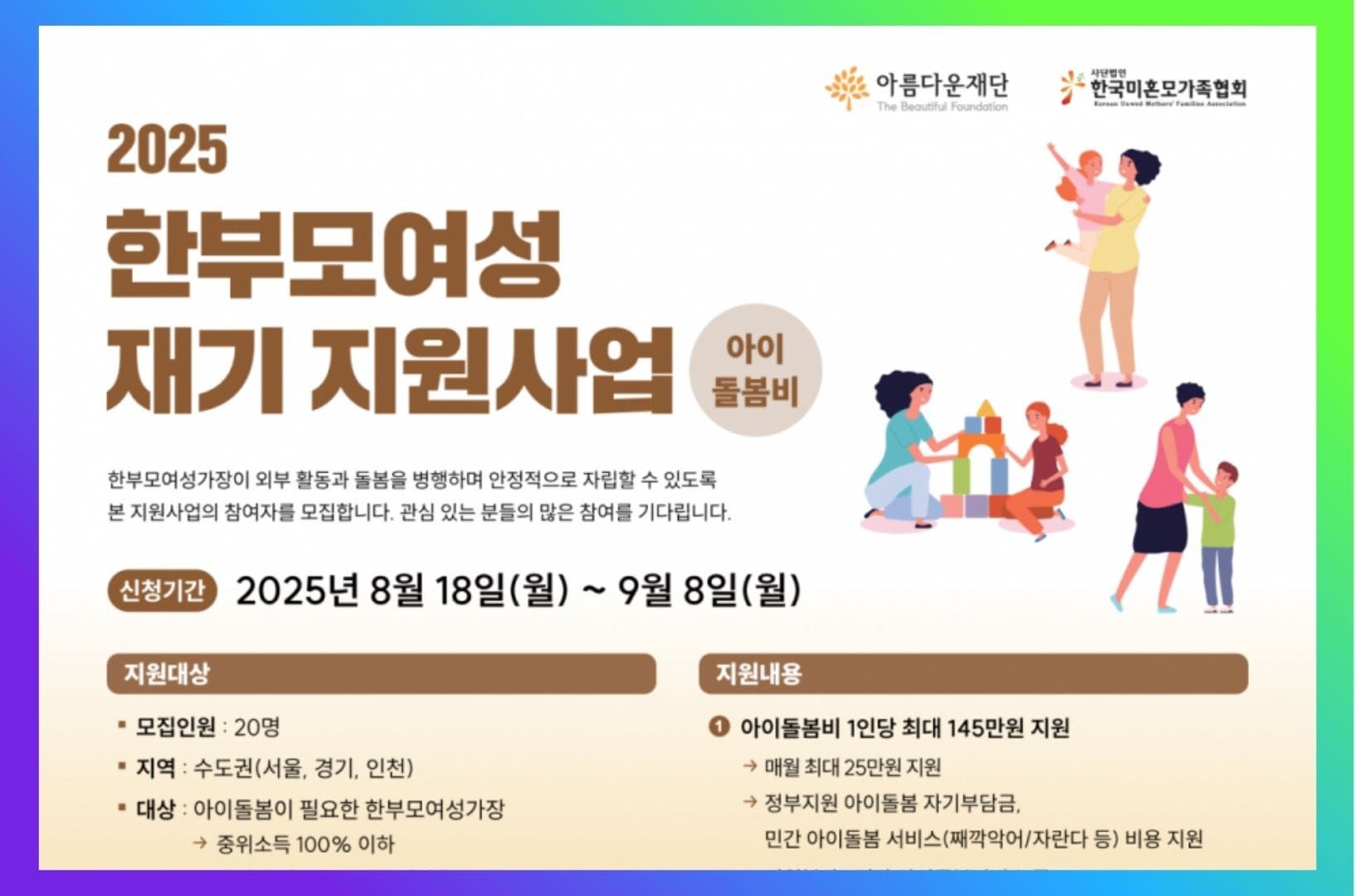 2025년 한부모여성 재기 지원사업(아이돌봄비)』 참여자를 모집합니다.