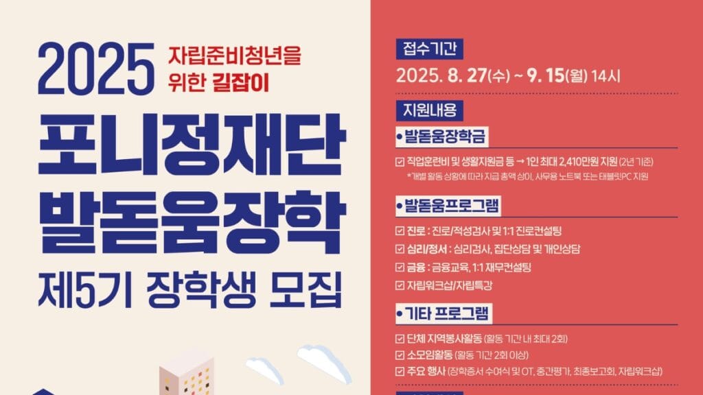 [전국]2025 포니정재단 ‘발돋움장학’ 제5기 모집: 자립준비청년에 최대 2,410만원 지원(8/27~9/15)