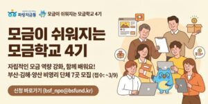 모금이 쉬워지는 모금학교 4기는 지역 기반 비영리 단체와 기관이 자립적인 모금 역량을 갖출 수 있도록 돕는 교육·실습 중심의 지원사업이다. 모금 기초 이론부터 온라인 모금 콘텐츠 기획, 디지털 마케팅까지 단계별 교육을 제공하며, 카카오같이가치 온라인 모금 캠페인을 직접 실행할 수 있도록 실무 전반을 지원한다. 교육과 실습을 통해 지역 단체가 지속 가능한 모금 구조를 마련하고 안정적인 활동 기반을 구축하도록 돕는 것을 목표로 한다.