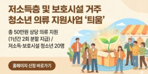 저소득층 및 보호시설 거주 청소년 의류 지원사업 ‘틔움’은 경제적 어려움을 겪는 청소년과 보호시설 거주 또는 퇴소 청소년을 대상으로 의류를 지원하는 사업이다. 총 50만 원 상당의 의류를 1년간 2회에 걸쳐 분할 지급하며, 참여 청소년은 자사 브랜드 제품을 자유롭게 선택할 수 있다. 신청은 2026년 1월 30일부터 2월 22일까지 진행되며, 선정 결과는 2월 26일 개별 안내 예정이다.