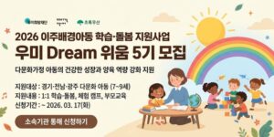 우미희망재단이 추진하는 ‘2026 이주배경아동 학습·돌봄 지원사업 우미 Dream 위움 5기’ 참여 가정을 모집한다. 본 사업은 다문화 및 이주배경 아동 가정을 대상으로 찾아가는 1:1 학습·돌봄 프로그램을 제공하고, 또래 관계 형성을 위한 캠프와 보호자 대상 부모교육을 함께 운영하는 통합 지원 프로그램이다. 전담 교사의 방문 학습과 다양한 체험 활동을 통해 아동의 학습 역량을 높이고 가정의 양육 역량을 강화하여 건강한 성장 환경을 지원하는 것을 목적으로 한다.