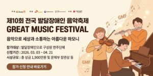 하트-하트재단과 SK이노베이션이 함께하는 ‘제10회 전국 발달장애인 음악축제 GREAT MUSIC FESTIVAL’ 참가자를 모집한다. 본 음악축제는 발달장애인으로 구성된 음악단체의 공연 활동을 지원하고 음악적 재능을 발굴하기 위해 마련된 문화예술 행사이다. 참가 단체는 예선 영상 심사를 통해 본선 진출팀이 선정되며, 본선은 2026년 9월 코엑스 오디토리움에서 진행될 예정이다. 발달장애 음악가들이 사회와 소통하고 음악적 역량을 펼칠 수 있는 문화예술 축제로 운영된다.