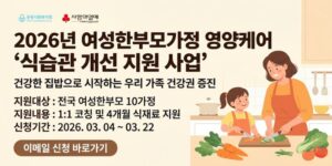 여성한부모가정의 건강한 식생활을 지원하기 위한 ‘영양케어 식습관 개선 지원 사업’ 참여자를 모집한다. 본 사업은 집밥 실천을 중심으로 전문 강사의 대면 코칭과 비대면 요리 코칭, 식재료 지원을 통해 가정의 건강한 식습관 형성을 돕는 프로그램이다. 선정된 가정에는 4개월 동안 식재료 지원과 요리 레시피 안내, 식생활 관리 활동이 제공되며 여성한부모가정의 건강권 증진과 식비 부담 완화를 목적으로 운영되는 지원사업이다.