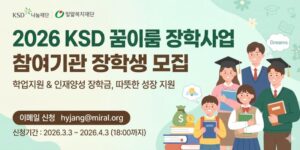 2026 KSD 꿈이룸 장학사업은 학업 의지가 있는 초·중·고·대학생을 대상으로 장학금을 지원하는 사업이다. 학업지원형과 인재양성형으로 구분하여 연간 최대 400만원까지 지원하며, 기관을 통해 신청할 수 있다. 선정 후 장학금 지급과 사례관리 및 결과보고가 진행된다. 전국 단위 모집으로 70명을 선발한다.