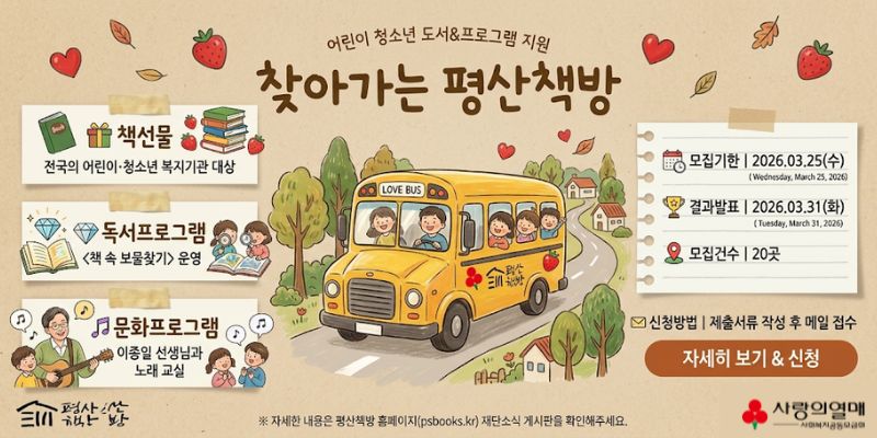 - [강원]2026년 독서동아리 육성 공모 사업 계획 재공고 (강원지역본부)조회수 39 | 마감 2026년 03월 13일